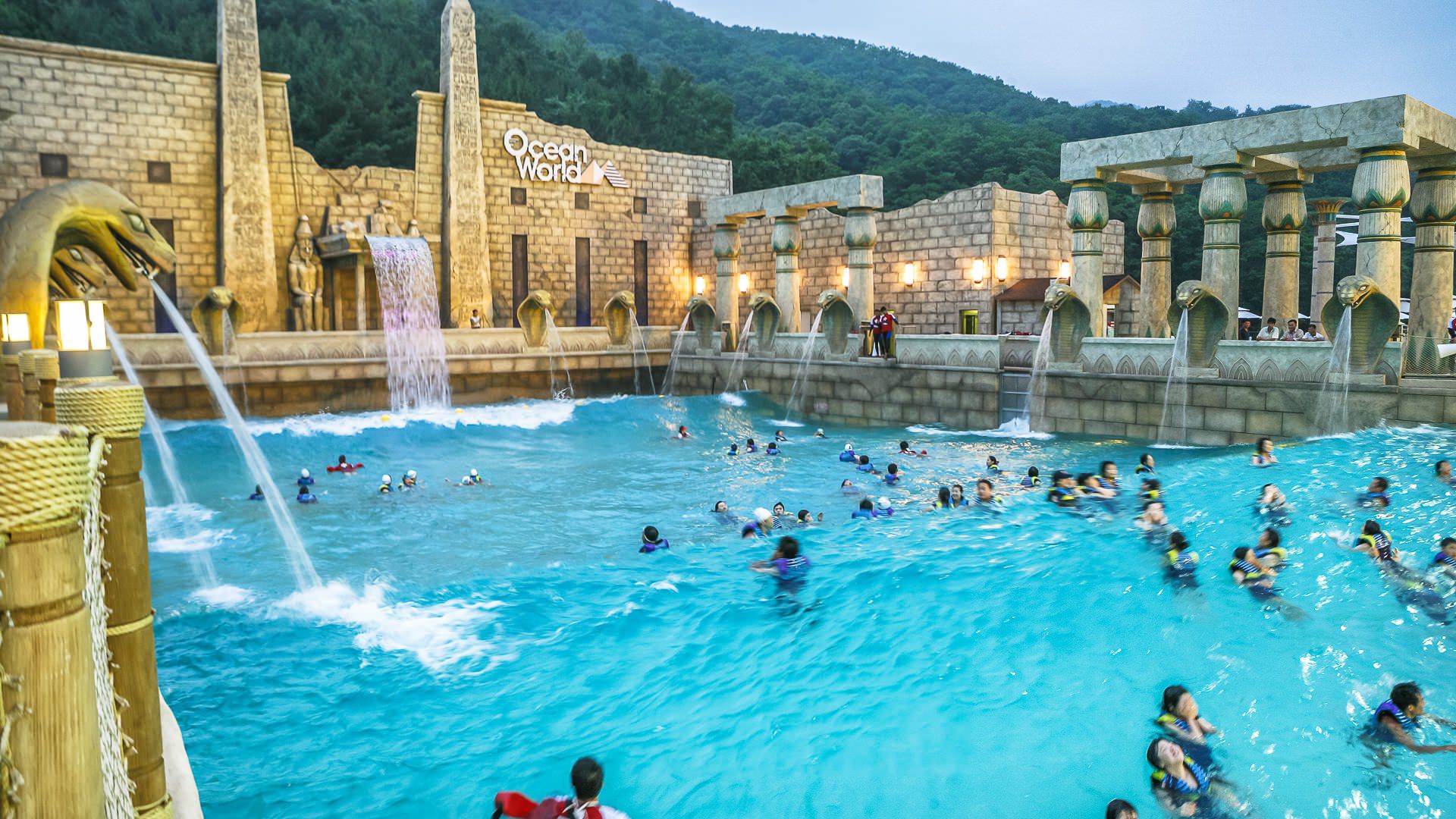 강원도 홍천군 팔봉산 자락에 위치한 비발디파크 오션월드는 그동안 국제적인 스키장으로, 이미 세계적인 관광명소로 정평이 나있는 비발디파크 내에 실내 13,223m²(4,000평), 실외 23,140m²(7,000평) 그리고 호수공원 49,587m²(15,000평) 등 총 99,174m²(3만 평)의 규모로 설계되었으며, 동시수용 가능 인원이 1만 명에 육박합니다. 다른 물놀이 시설들과는 달리 비발디파크 오션월드의 전체적인 테마는 광활한 사막의 오아시스처럼 뜨겁게 작열하는 태양의 에너지와 차갑게 몸을 식혀주는 맑은 물의 짜릿함을 추구하기 위해 이집트 사막의 오아시스 풍으로 전체를 설계했고, 거대한 스핑크스와 피라미드 이미지를 이용해 이집트 특유의 신비성과 주목성을 바탕으로 시설물이 제작되어 기존의 워터파크들과 차별화를 두었습니다.
